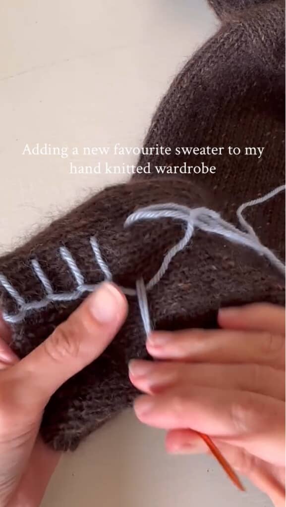 (1/4)ブラウンのセーターにブルーの毛糸でざくざく縫っていくと……