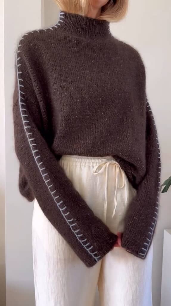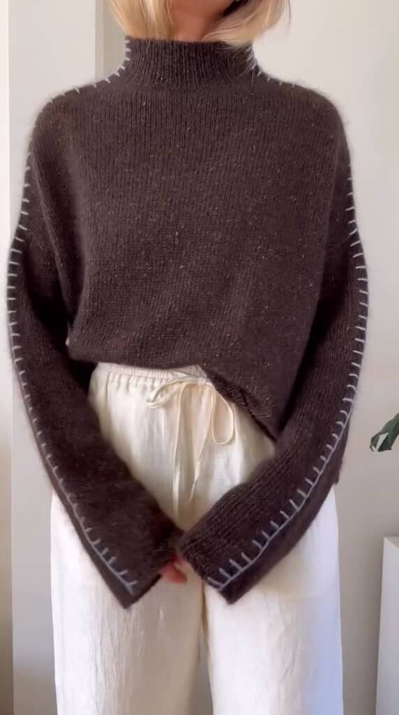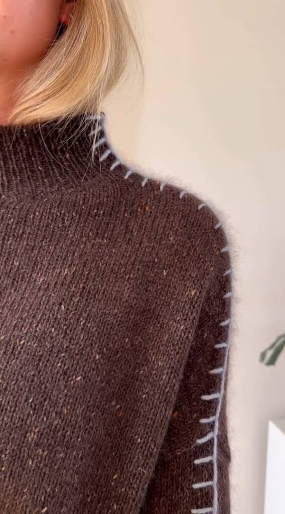 (2/4)一見完成に見える無地のセーター、袖に大きなステッチを入れアクセントに