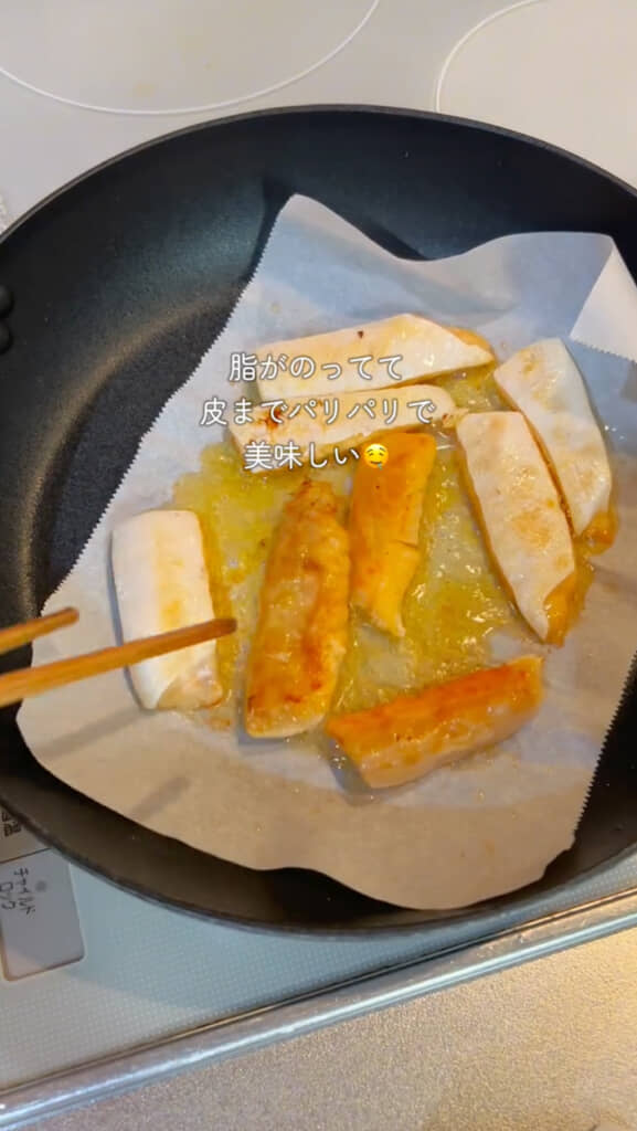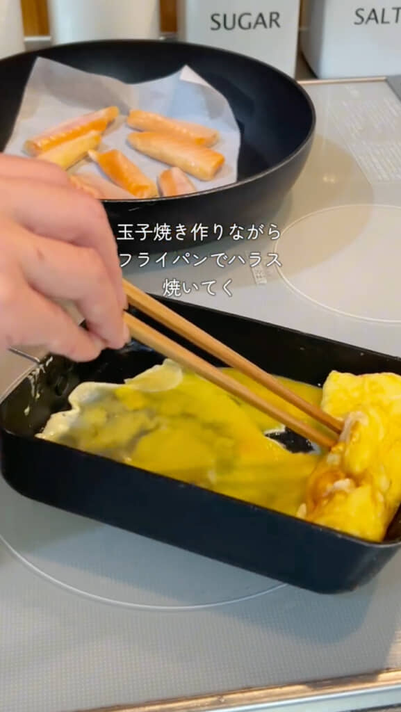 今回作るのは、「皮までおいしい焼きハラス弁当」。まずは玉子焼きを作りながら、別のフライパンで鮭ハラスを皮目から焼いていきます。油が乗っているためほぼ揚げ焼き状態で皮はパリッパリ! 娘さんはこの香ばしい皮がお気に入りなのだとか。