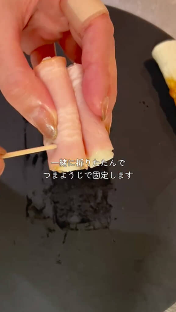 続いてちくわを縦に切って開き、ベーコンに乗せて一緒に折りたたみます。そして、2本のつまようじで留めたら、真ん中をカット。マヨネーズをひと塗りしてトースターで3分ほど焼けば、コロンとかわいいハート形ちくわベーコンが完成です。