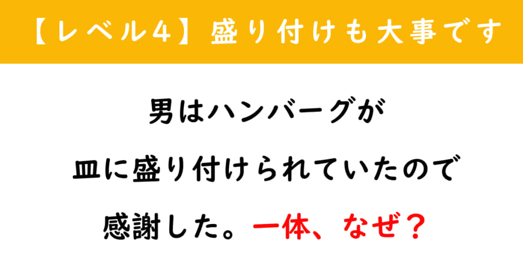 男はハンバーグが皿に盛り付けられていたので感謝した。一体、なぜ? 「ウミガメのスープ」クイズに挑戦!【レベル4】