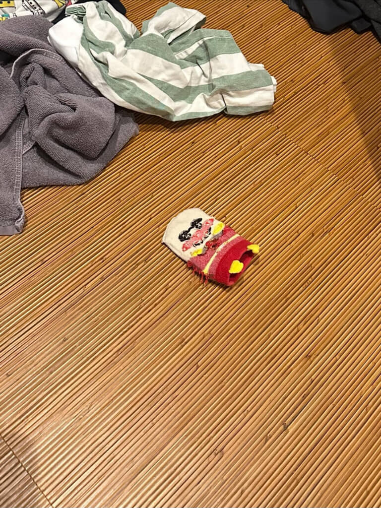 それはなんと、ひっくり返った状態のアンパンマンくつ下。特徴的な赤や黄色などからその姿を推測できますが、裏側から見ると違う生き物みたいだ……。