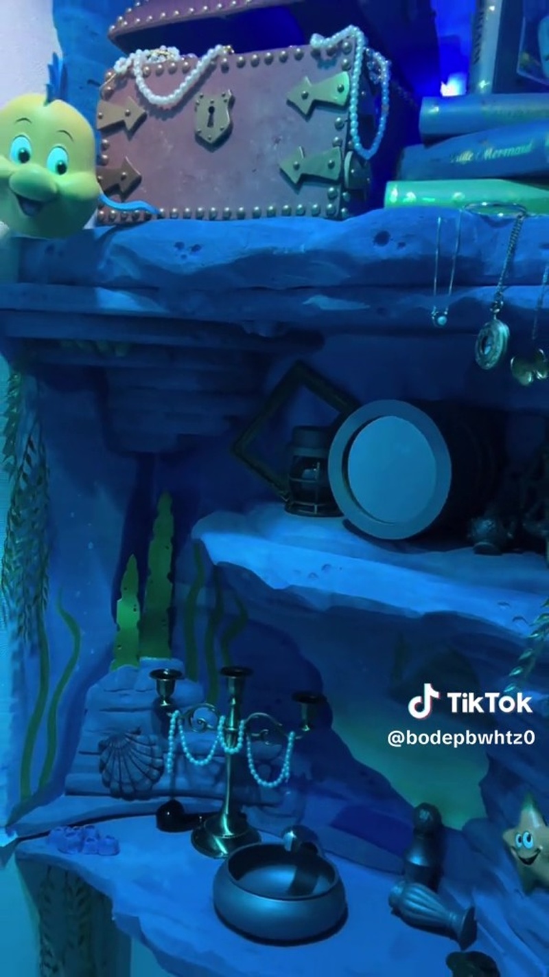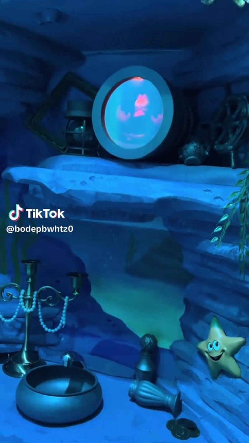 投稿者はTikTokユーザーの玄関飛び出し系ネコ(@bodepbwhtz0)さん。自宅トイレを東京ディズニーシーでアリエルと仲間たちが暮らす海底王国・マーメイドラグーンの世界に大改造しました。トイレ本体の上のスペースをまるで海の中かのような優雅で美しい世界に仕上げています。