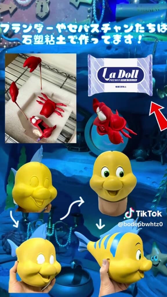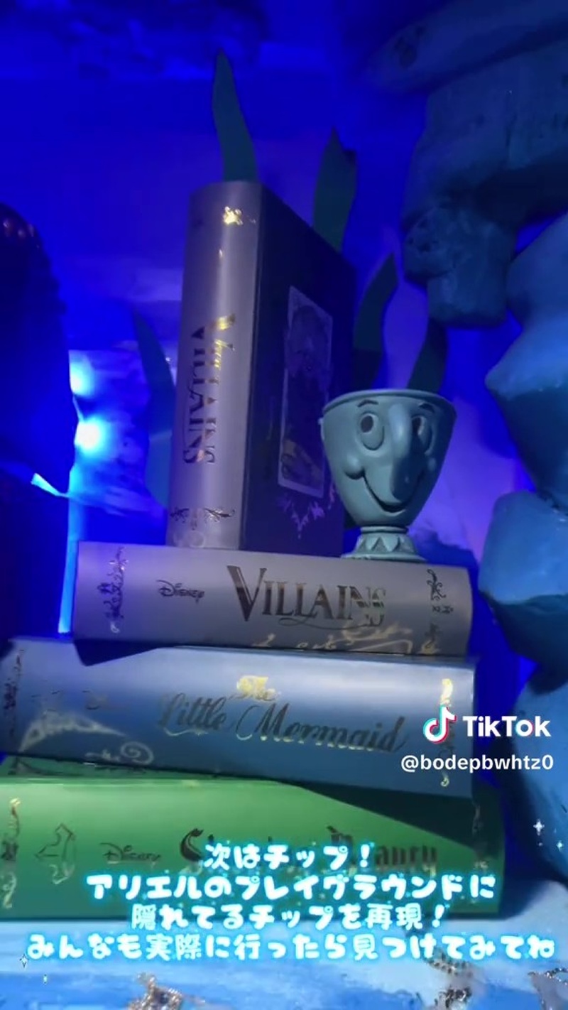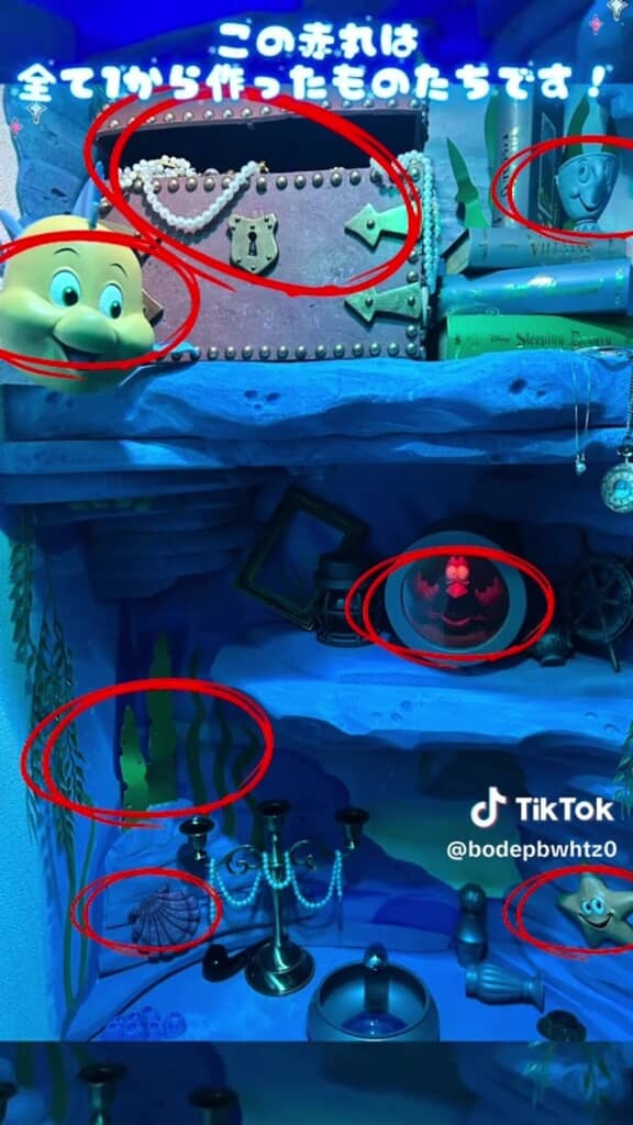 宝箱のそばにはフライングフィッシュコースターのフランダー、ケースの中にはアリエルのプレイグラウンドにいる驚いたような表情のセバスチャンが見事に再現されています。ほかにも本の上にはアトラクションに隠し要素として存在しているチップの姿も見られました。どのキャラクターたちも驚くほどのクオリティーですね。かわいい!