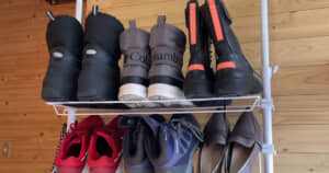 突っ張り式のシューズラック。雪国なので靴の量は多め