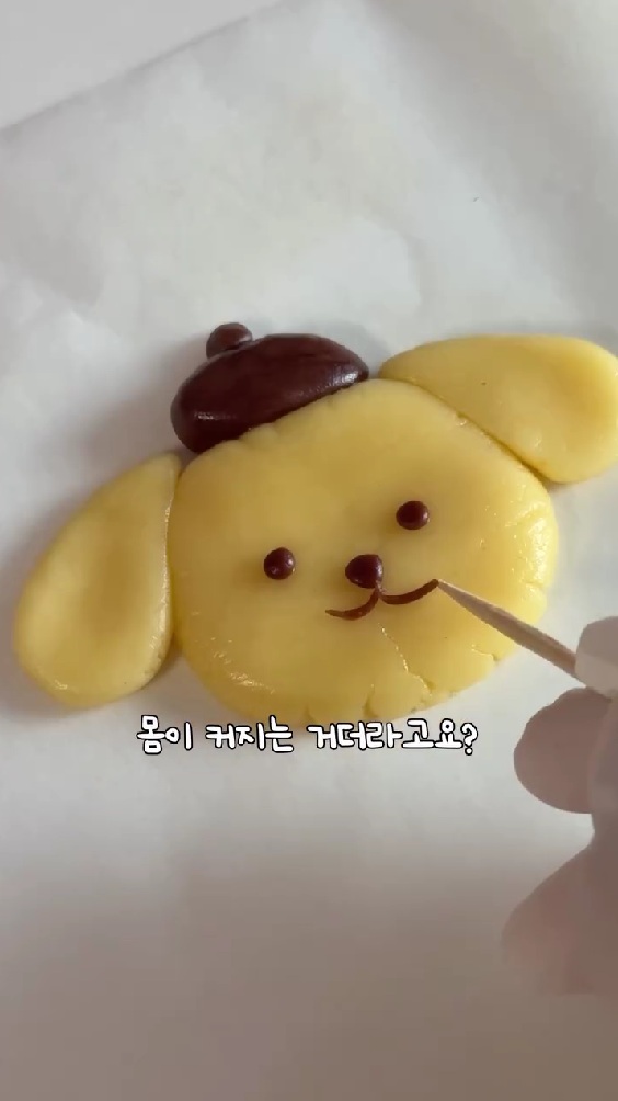 今回紹介するのは、ポムポムプリンのクッキーを作っていると思ったら、予想外の姿が誕生してしまう動画です。ポムポムプリンの顔となるクッキー生地に、つまようじで表情を描き込む投稿者さん。生地は淡い黄色で、プリンのほっこりした丸顔に、落ち着いた茶色のベレー帽がちょこんと乗っており、とってもかわいいですね。投稿者さんが丁寧に目・鼻・口を描き込み、愛らしい表情になるようこだわっている様子が伝わってきます。
