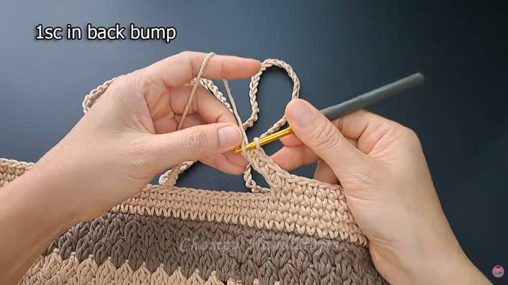 同じ要領でまた進んでいき、70目のくさり編みまでたどり着いたら、まず2目1度に細編みし、裏山に針を入れて細編みで編んでいき、最後も2目1度に細編みします。そして開口部を1目ごとに細編みで進み、反対側の持ち手も同じように編みました。