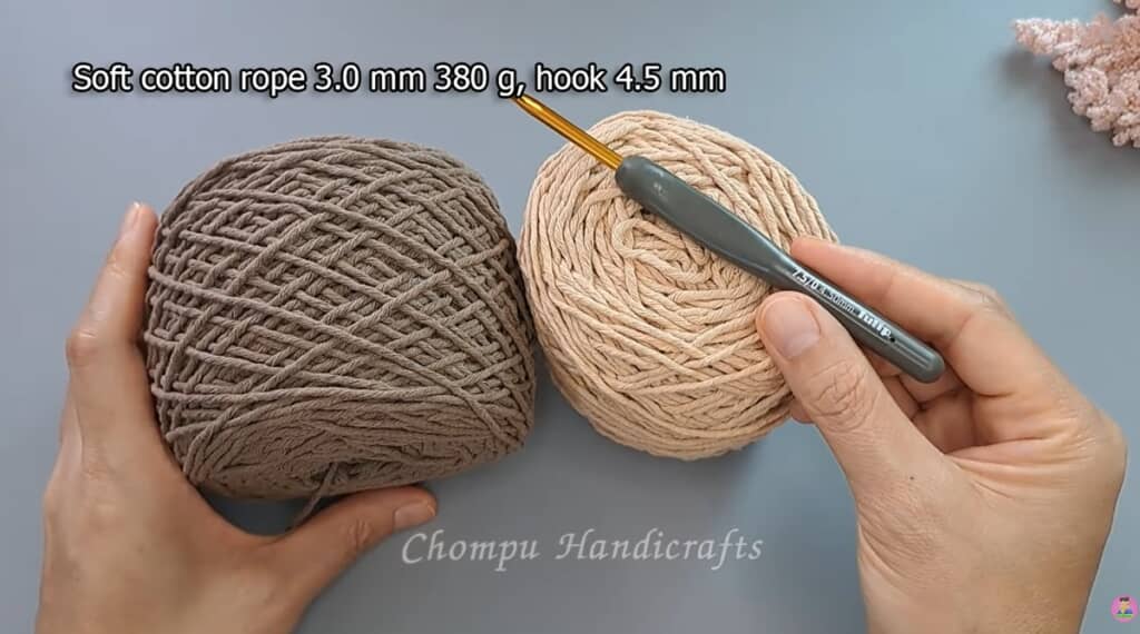 用意するのは3ミリのソフトコットン糸が2色。今回はグレージュのような色合いと、ベージュの色味を選びました。使用するかぎ針は4.5ミリ(7/5号)です。