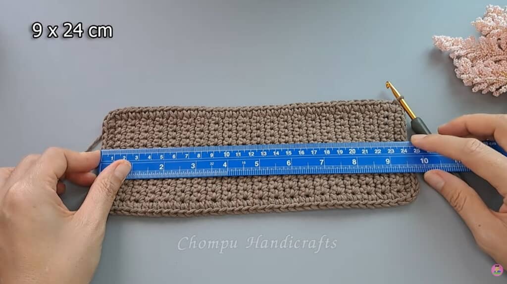 編み終わったところから、まず1目くさり編みで立ち上げ、1辺を1目ごとに細編みで編みます。端まで来たら3目細編みで角を作り、また次の辺を1目ごとに細編み。これを繰り返して長方形をぐるりと1周すると、サイズはおよそ縦9センチ、横24センチの長方形になりました。これがバッグの底になります。