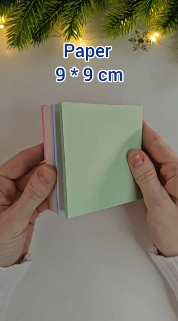 1/4)最初に用意するのは、1辺9センチの正方形の色紙。動画では複数色を準備し、その中からグリーンの紙を1枚選択