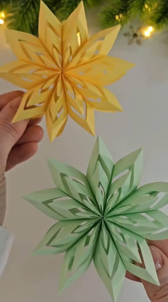 4/4)中央部分だけをのりで貼り合わせ、切り込みを広げていくと完成。雪の結晶のような華やかな飾りが姿を現す