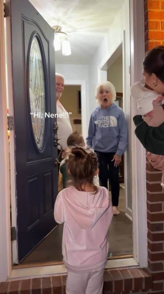 扉を開けたおばあちゃんは、孫たちや息子夫婦の顔を見て一瞬、何が起こったか分からないというような表情に。そしてすぐさま状況を理解すると、喜びを全身から爆発させたような笑顔で、うれしい叫び声をあげました。