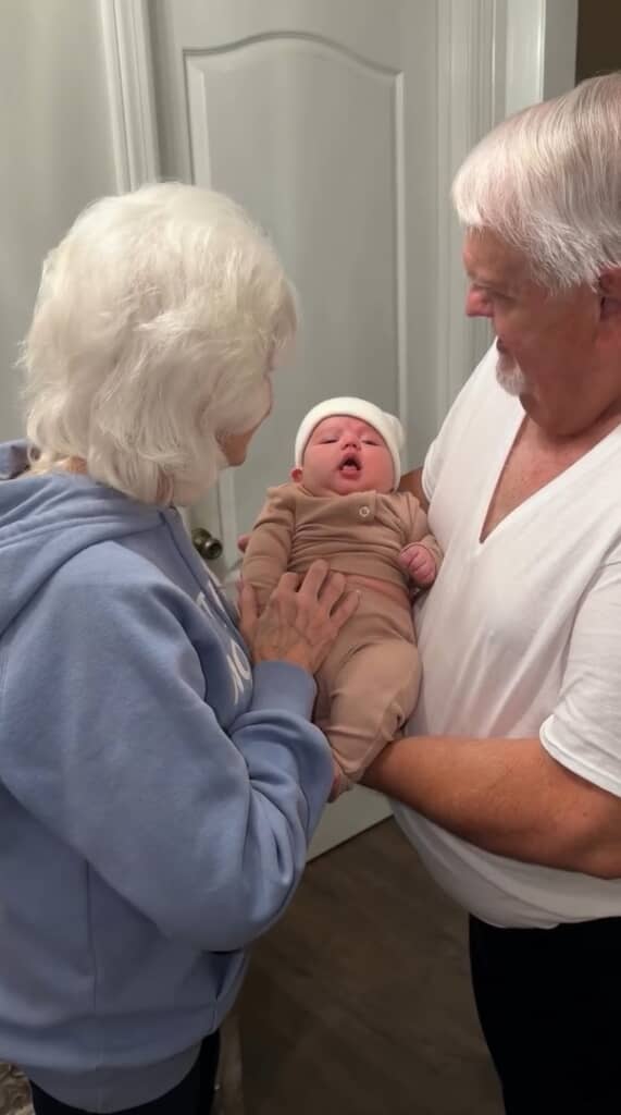 そして、おじいちゃんと一緒に小さな赤ちゃんと対面し、これ以上なく優しい声で話しかけるおばあちゃん。心のうちからあふれ出すいとおしさが、画面越しに伝わってくるようですね。