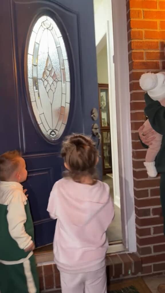 2/4)祖父母の家に到着し、玄関前でそわそわする子どもたち。長男くんが精いっぱい背伸びして呼び鈴を押す、緊張と期待の一瞬