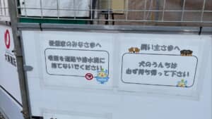 工事現場のフェンスに貼られた、愛煙家や犬の飼い主へ向けた注意書きの掲示