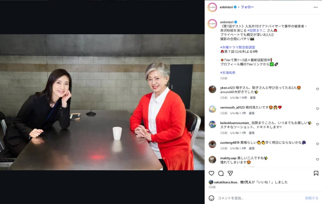 なお、「キントリ」主演の天海祐希さんは加賀さんと20年以上の親交があることで知られていますが、放送後に番組SNSへメッセージを投稿。