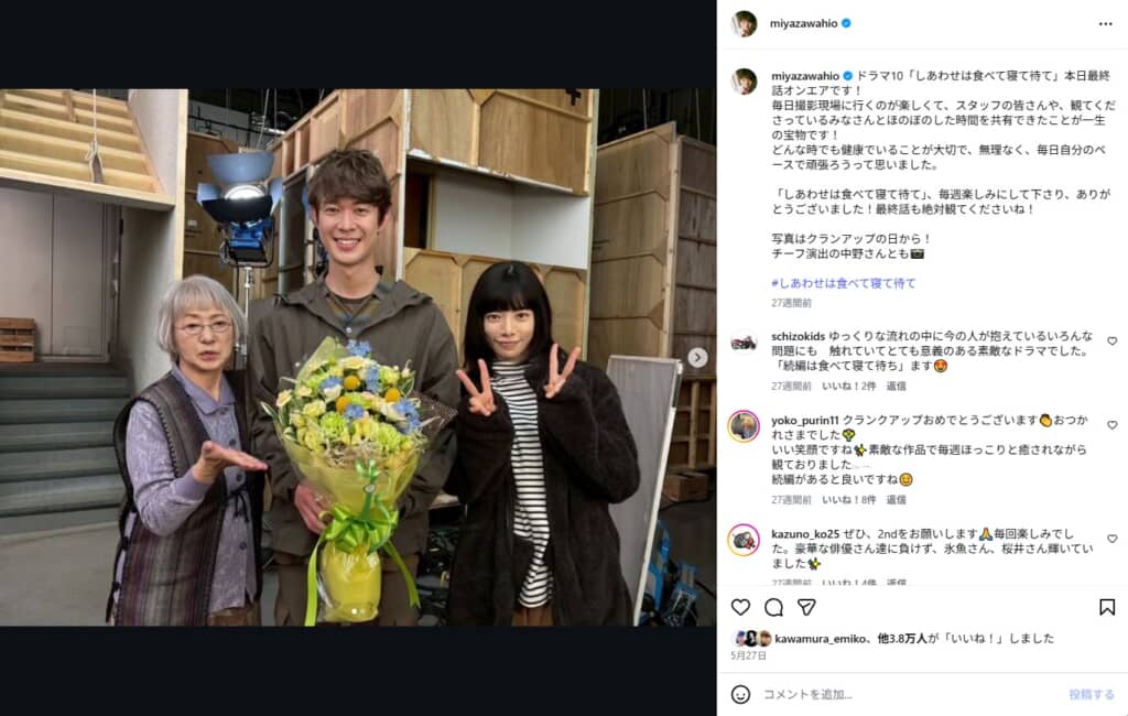 半年前に放送された「しあわせは食べて寝て待て」ではまた違った印象の役を演じた加賀さん(左端/画像は宮沢氷魚Instagramから)