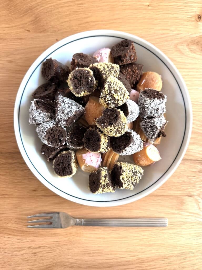 なんとそこには一口サイズにカットされたたくさんのドーナツが! 色んな味が楽しめるようにというすてきな配慮ですが、ゴールデンチョコレート、ココナッツチョコレート、ダブルチョコレート、ポン・デ・ストロベリー、ハニーチュロと5種類ものドーナツが用意されています。