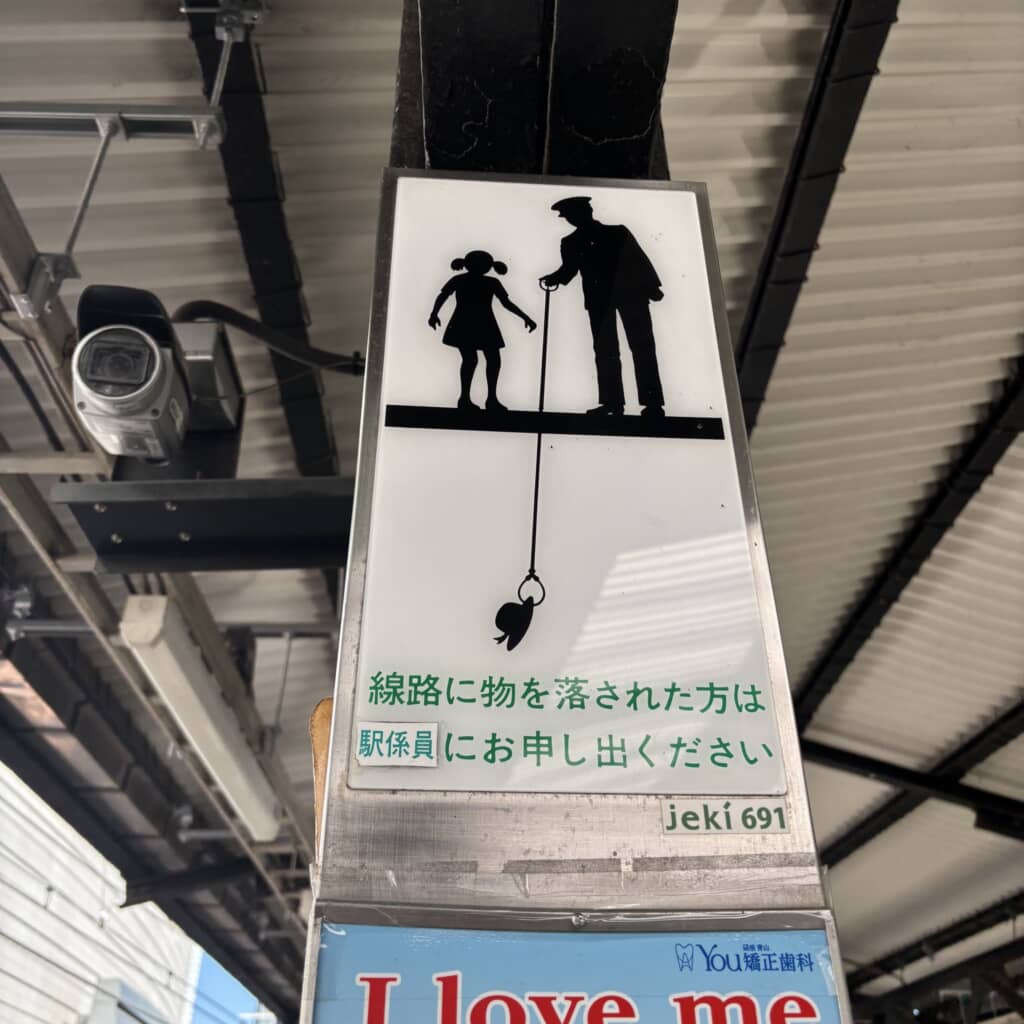 写っているのは、「線路に物を落とされた方は駅係員にお申し出ください」という利用客向けの案内が書かれたちいさな看板。女の子が落とした帽子を駅係員が回収している様子を表現した白黒のピクトグラムが特徴で、主にJRグループの駅構内やホーム上で見られます。