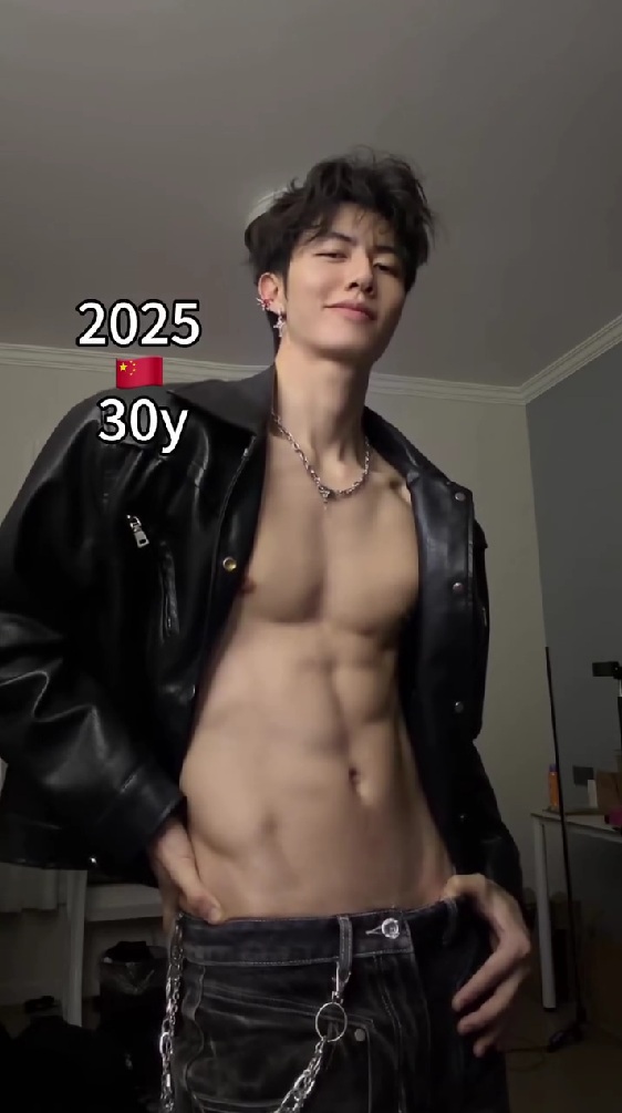 ところが2025年現在、30歳になった投稿者さんは、洗練されたモデルのようなビジュアルになっていました! 黒いレザージャケットを着用し、上半身をあらわにした投稿者さんの身体には、鍛え抜かれた腹筋と胸筋が浮かび上がり、脂肪の気配は一切ありません。