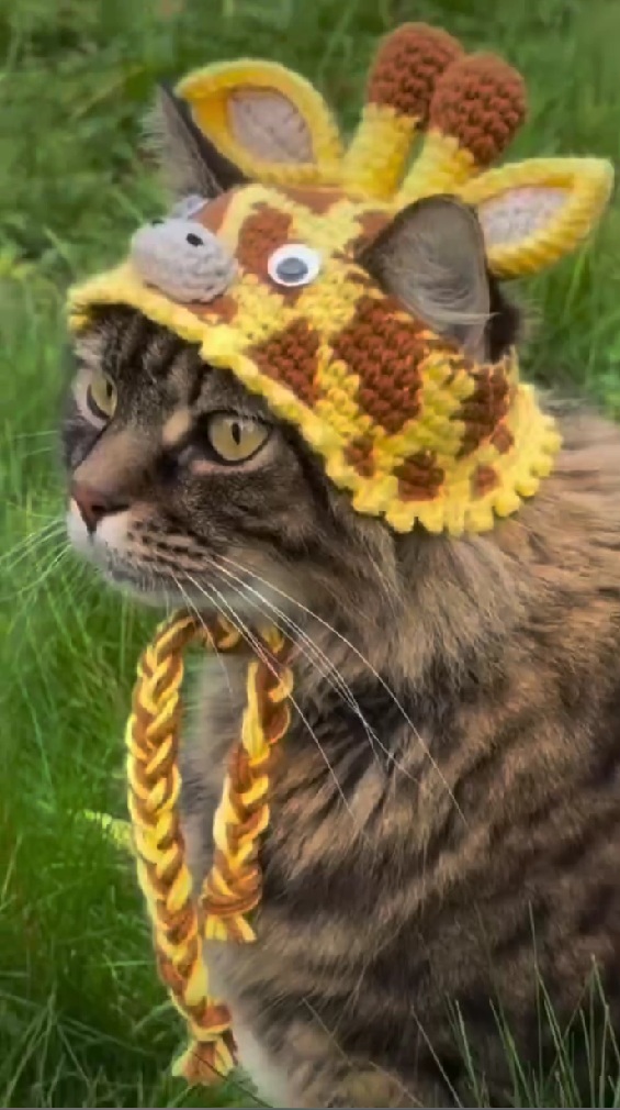 完成したキリン帽をふわふわの長毛猫ちゃんが装着した姿は、とってもキュート。存在感のあるキリンのツノと耳、猫ちゃんの耳がマッチしていて、ぬいぐるみのような愛らしさを放っています。猫ちゃんは日頃から帽子をかぶり慣れているのか見事なモデルっぷりを披露していますが、“猫なのにキリンになっている”自分の姿に驚いているようにも見えてきますね。