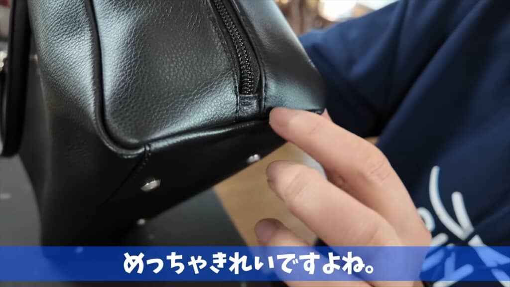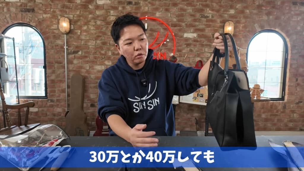 早苗バッグの定価は13万6400円ですが、今回は中古品を約8万円で購入したとのこと。「なんでこんなに売れるん?」と、まずはプロ目線でレビュー。デザイン性、機能性、耐久性において高度な工夫が凝らされたバッグだと高く評価しました。