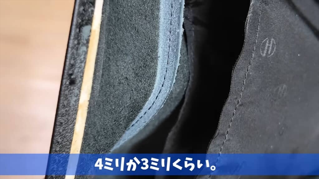 内装の縫い代は一般的な6ミリなのに対し、外装側は3ミリになっていました。角をゴワつかせずに美しく見せるための工夫ですが、「半分にしたら縫いにくくなるんですよね。ミスが増える」「縫いにくい、でもキレイに見える」と確かな技術が要求される手法で、ルイ・ヴィトンも採用しているのだそうです。