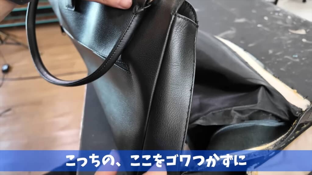 分解を始めてまず口に出たのは「芯材の使い方が日本っぽい」という感想。欧州系のハイブランドは芯材を多く使うのに対し、早苗バッグは必要最低限しか使っておらず、「革の素材の厚みで勝負する。すしみたいな感じ」と素材の良さを生かしている印象を受けたといいます。