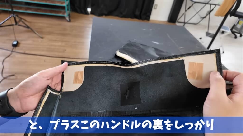 ハンドルの裏手側には、バッグの角をきれいに見せる芯材とハンドル裏の強度を上げる芯材を兼ねて使用しており、必要最低限の材料で済ます日本らしいものづくりを実感しました。金具の裏側には当たりが出ないように布テープを貼るなど、美しさのために細かな工夫も施してあります。