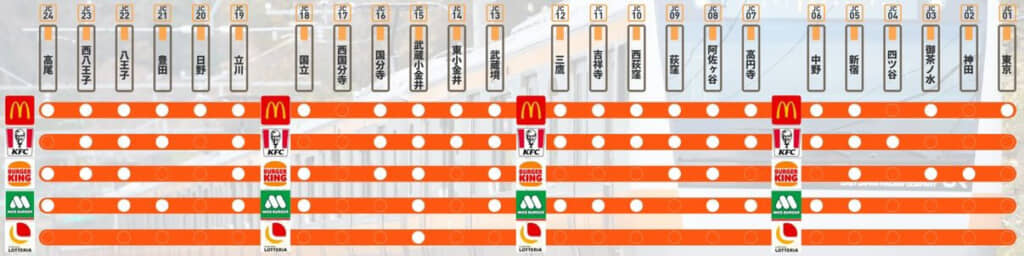 マクドナルド、ケンタッキーフライドチキン、バーガーキング、モスバーガー、ロッテリアの有無をまとめた中央線の路線図