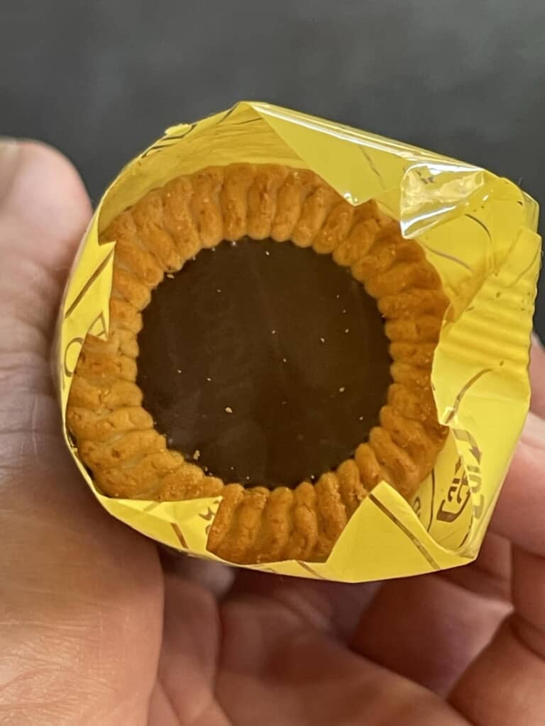 「チョコ&コーヒービスケット」は、中心にクリームがトッピングされたビスケット。チョコ味とコーヒー味が、それぞれ入っています。