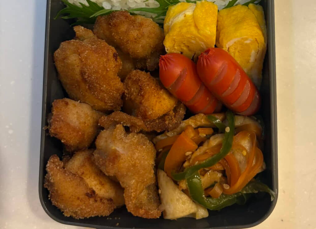 おかずには、息子さんが大好きな唐揚げがたくさん。他にも、ソーセージや卵焼きといった、子どもが喜びそうな食べ物がところ狭しと詰まっています。