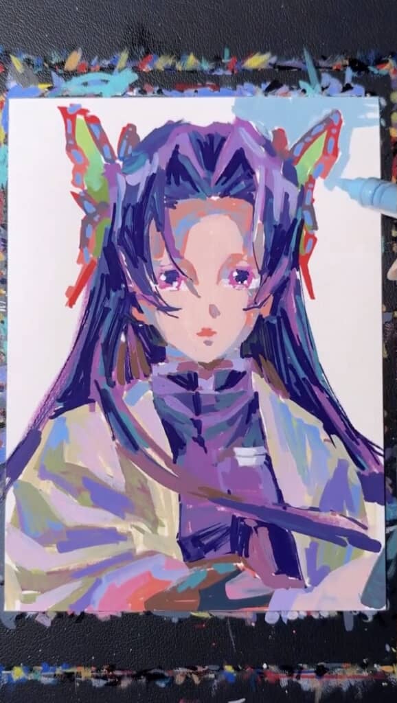 素人目には適当に塗っているのではないかと見えるほど、豪快なタッチで描き始めていくmatt_art1108さん。太いペンでイラストの大枠を作ると、その内側をこれまた大雑把に塗りつぶしていきます。本当に胡蝶カナエになるんだよね……?