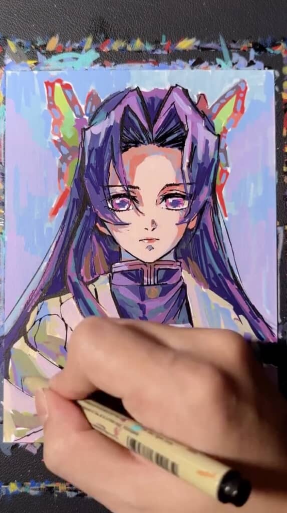 5/7)細いペンに持ち替えて細部に命を吹き込みます。瞳の輝きや髪の陰影が繊細に描かれ、ぐっと表情豊かに
