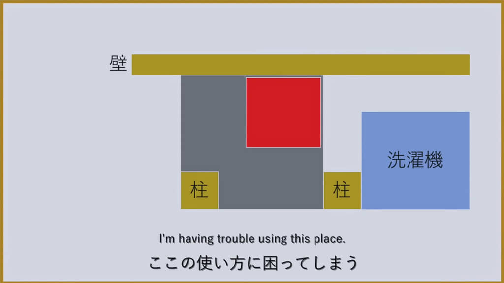 棚を設置するスペースはおおむね四角形になっています。ちょうど邪魔な場所に柱が2本あるため、その形に合わせて棚を作る必要があります。