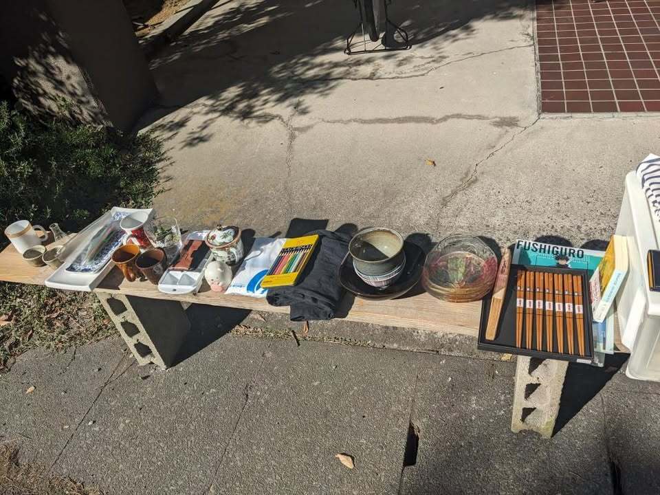 やまのうちさんが見つけた「うそみたいなもの」とは……「ご自由にどうぞ!」の言葉とともに道端に置かれた物品の数々! コップや食器、文具など多種多様なアイテムが手作りの台の上に整然と並んでいます。いずれもキレイで、すぐにでも使えそうなものばかりです。お店でリユース品を買うはずが、こんな良いものを無料でもらえるなんてラッキーすぎる!