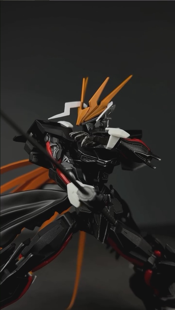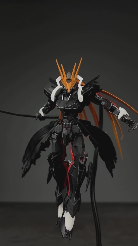 今回ご紹介するのは、ガンプラを漫画『BLEACH』風にアレンジした動画です。動画の冒頭、黒を基調としたフォルムのガンプラが静かに立っています。腰には布が破れたように加工されたパーツが取り付けられており、頭部には独特なオレンジ色の角が伸び、どこか『BLEACH』の主人公・黒崎一護を思わせます。
