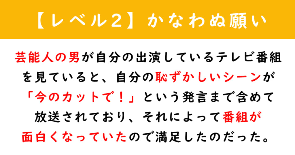【解答】芸能人の男が自分の出演しているテレビ番組を見ていると、自分の恥ずかしいシーンが「今のカットで!」という発言まで含めて放送されており、それによって番組が面白くなっていたので満足したのだった。