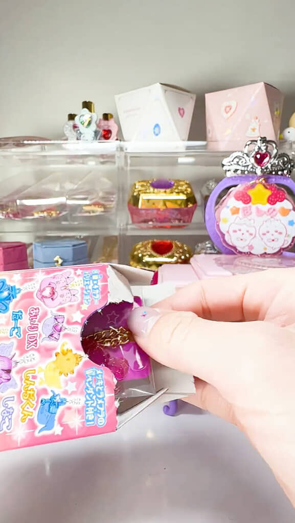 そして、ドキドキしながら封を開けてみると……なんと中から狙っていた、しなこさんのペンダントが登場! まさかの一発的中に、ぽしのさんも「おお、すご!」「めっちゃ可愛い」と思わず大興奮。しかも、カラーはピンクでとってもキュートです。