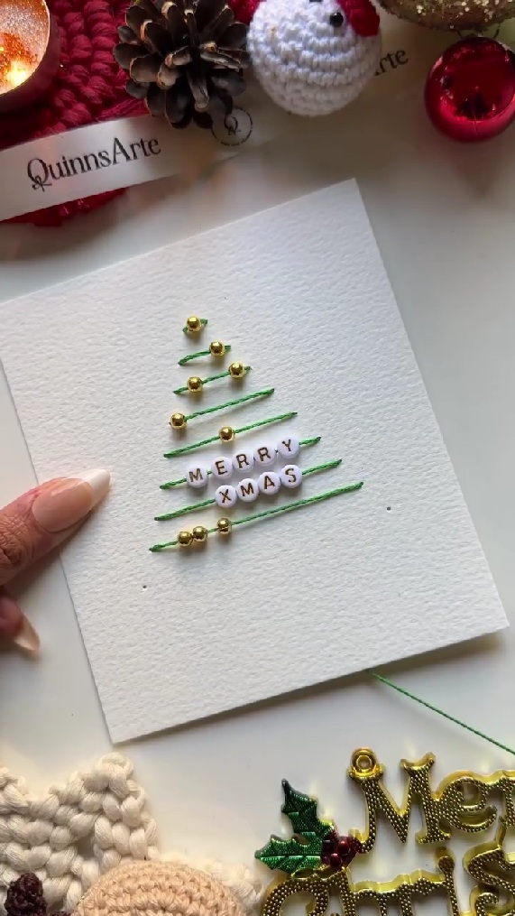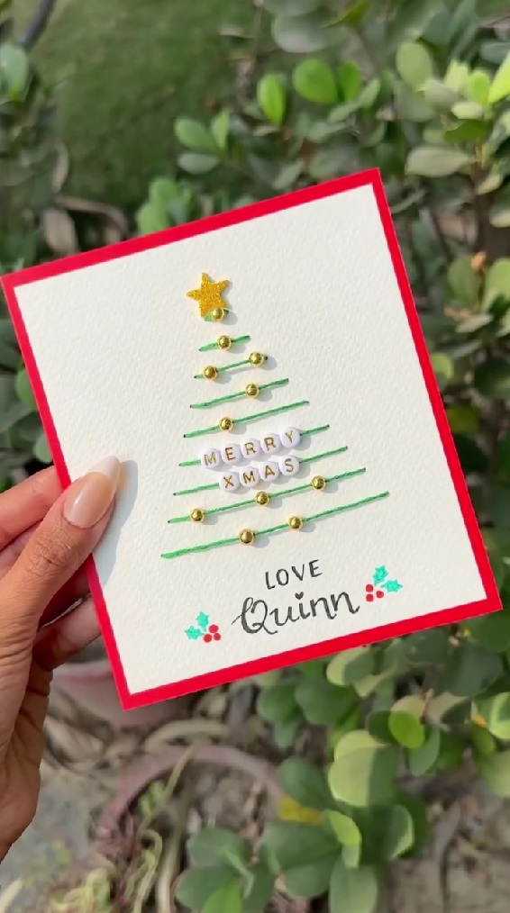 緑の糸でクリスマスツリーを、金色のビーズでオーナメントを、白いビーズで「MERRY XMAS」を表現した投稿者さんは、ツリーのてっぺんに小さなゴールドの星飾りを追加。さらに、紙の下部には美しい筆記体の署名と、周りに赤と緑でヒイラギのワンポイントイラストを描き添えます。