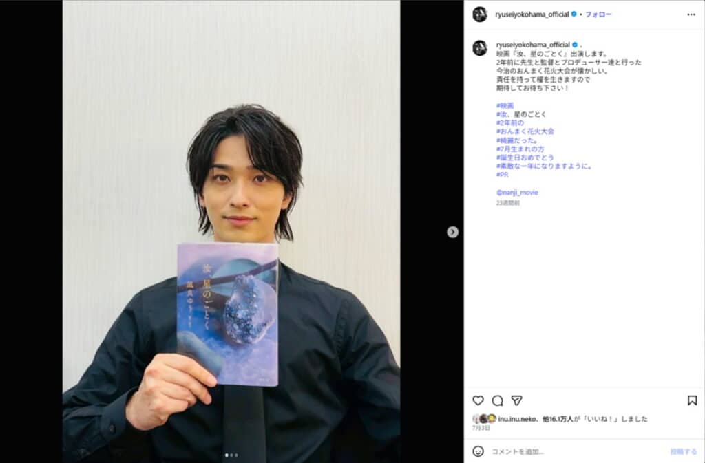 映画『汝、星のごとく』への出演を報告していた横浜さん(画像は横浜流星Instagramから)