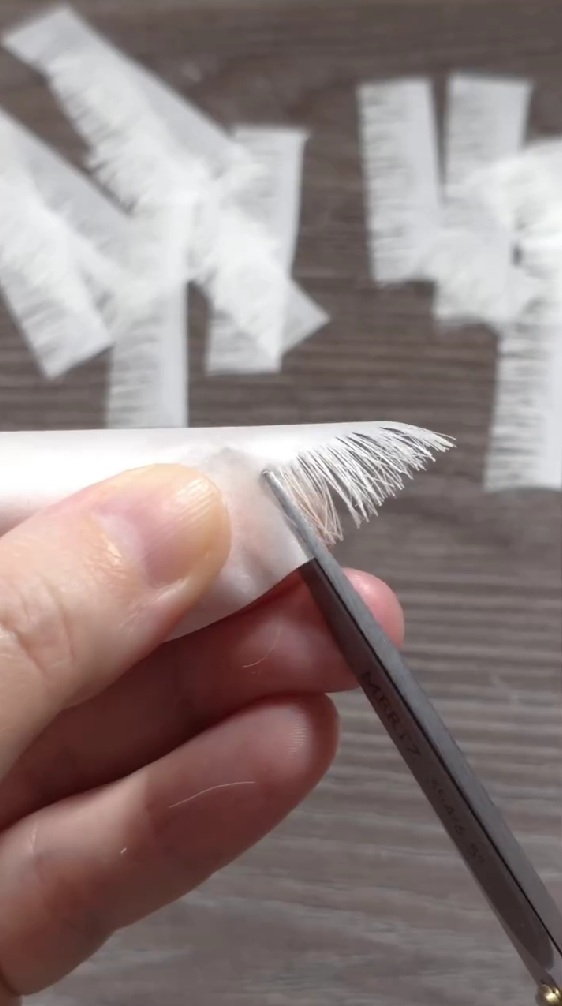 動画の冒頭、投稿者さんが手にしているのは薄めの白い布。そこにハサミを入れ、1本1本が髪の毛のような細さになるまで丁寧に裁断していきます。