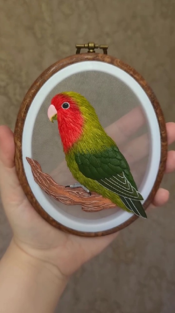 仕上げに目の位置を調整し、光沢のある黒い瞳を描き込むと……とってもリアルな鳥のアートが完成! 刺しゅう枠がバードスイングのように見えて、そこにちょこんととまったラブバードやオカメインコなどの小鳥たちがとっても愛らしいですね。丸いフォルムも鮮やかな色も、本物かと見紛うほどの出来栄えです。