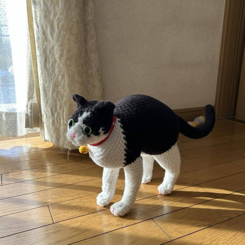 本物の猫ちゃんと並んでいる写真では、猫ちゃんが不思議そうにあみぐるみを見ていました。猫と一緒に暮らし、愛情深く接しているからこそこのリアリティが生まれるのでしょう。とはいえ編み物でここまで表現できるなんて驚きですね!