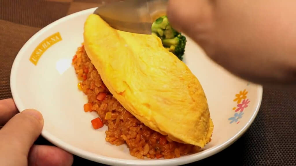 そして、あいくろうさんはオムレツに包丁を入れます。テレビやSNSなどで話題の、“ふわとろオムライス”を再現するようです。オムレツの中心を軽く切るとその中身がとろ~っと出てきて、柔らかそうなオムライスが完成するはず……!