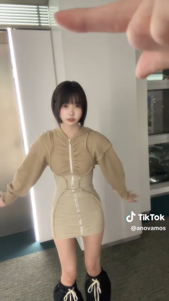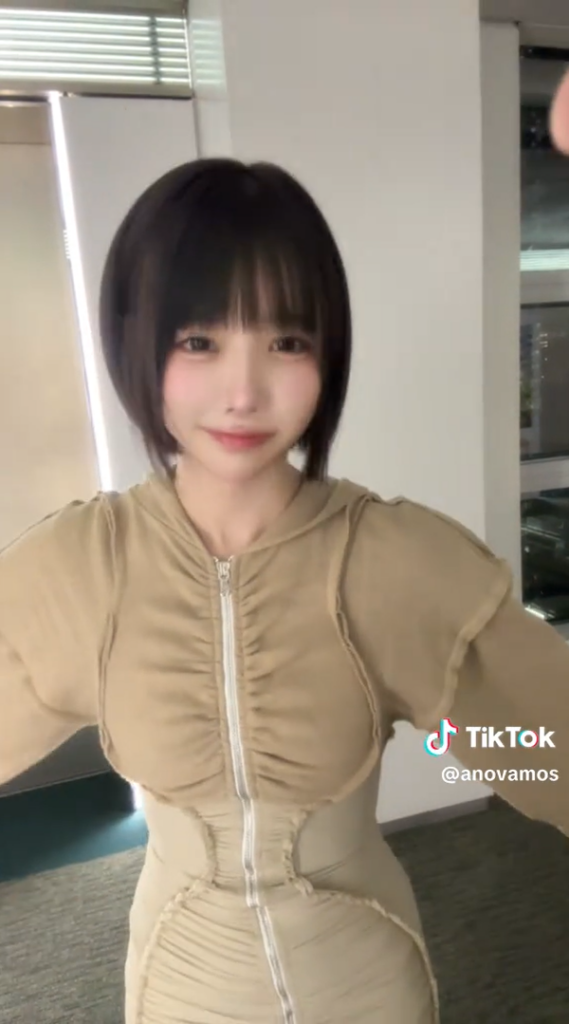 あのさんは、TikTokで流行中の音源に合わせたダンスを公開。タイトなベージュのワンピースに、黒色のレッグウオーマーを着用しています。