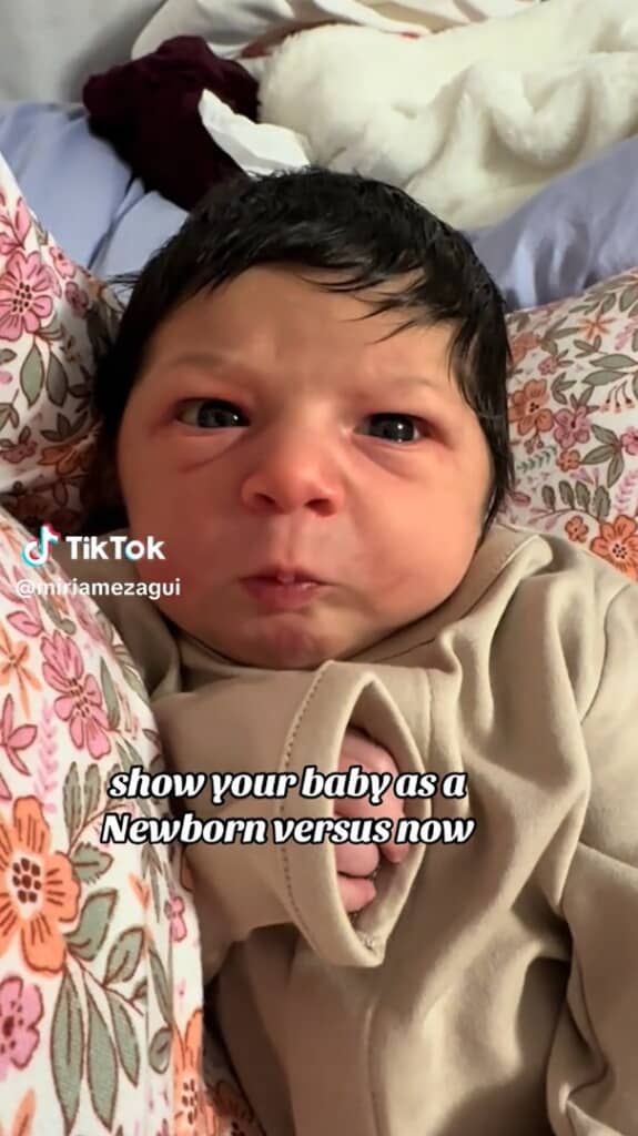 (1/2)新生児のとき。ふさふさの黒髪でストレートで誕生。目力も強い!