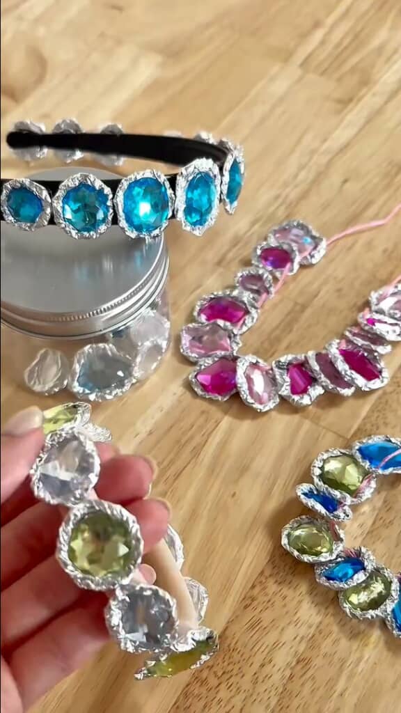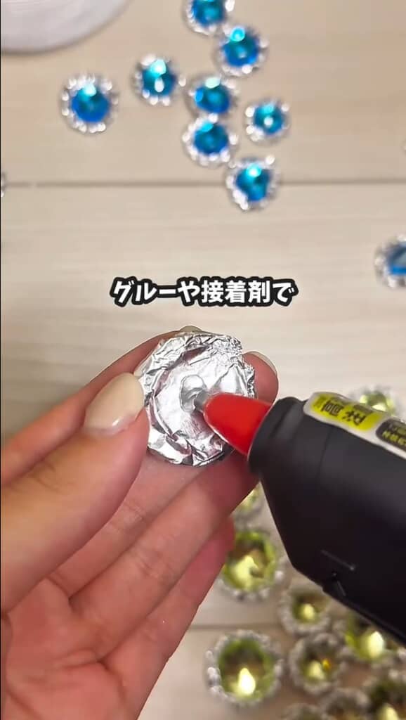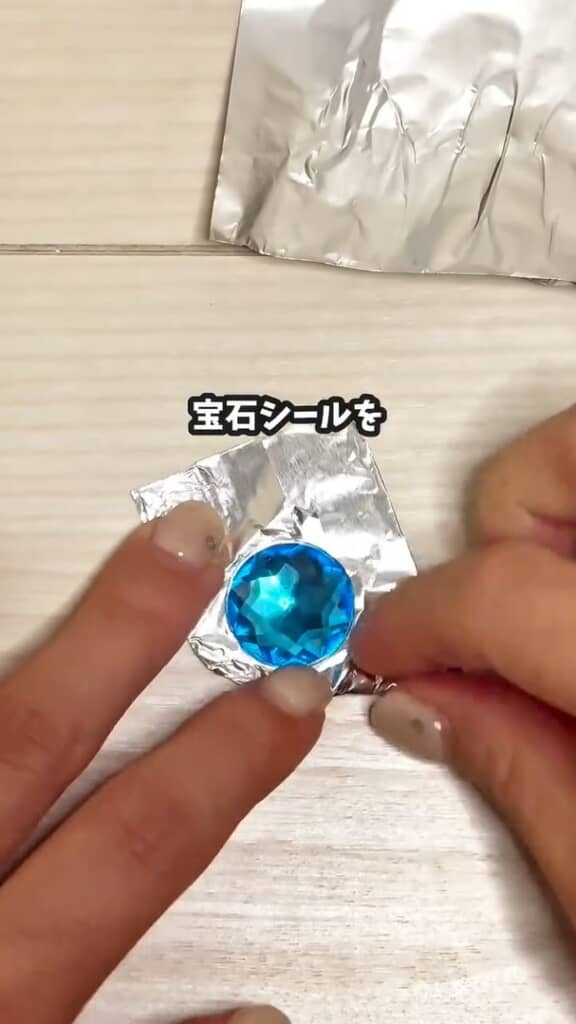 100均で購入した宝石風のラインストーンシールを中央に置き、アルミホイルでぎゅっと包み込む。立体感が増して一気に宝石らしく