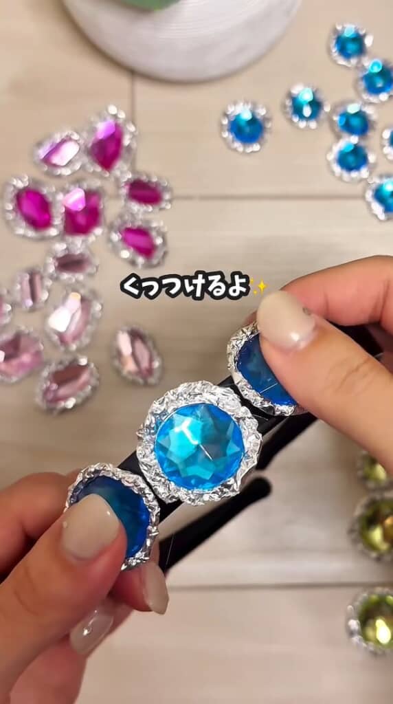 完成した宝石風パーツの裏に接着剤を付け、カチューシャなど好みのアイテムへ。貼り付けるたびに華やかさが増していく