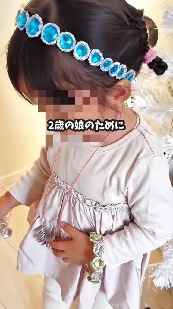 完成したアクセサリーを身につけた娘ちゃんは笑顔いっぱい。2歳の頃に作ったという思い出と一緒に、プリンセス気分を満喫